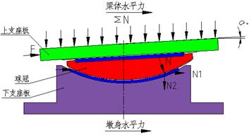 當(dāng)球冠凸面與活塞凹面間轉(zhuǎn)動,同時發(fā)生水平滑移時,球冠將自動調(diào)整姿態(tài)使活塞的作用力合力始終保持在球冠底平面中心,使球冠底平面處于均勻受壓狀態(tài)。同時活塞在發(fā)生轉(zhuǎn)動時,不會出現(xiàn)因受到球冠和鋼盤壁的同時約束而產(chǎn)生附加力,活塞僅僅傳遞支座結(jié)構(gòu)產(chǎn)生的水平力。充分發(fā)揮了支座鋼盤內(nèi)球冠與活塞間的有效約束和鋼盤壁有效傳遞支座活塞水平力的作用。